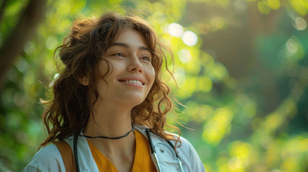 Happy and Radiant Young Woman Smiling in Sunlit Forest Surrounded by Lush Green Trees
