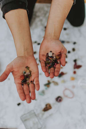 Floor, healing and woman with healer, hands and ritual for self awareness, meditation and gemstone. Inner peace, chakra and zen with ceremony for soul, holistic and awakening of person with mantra