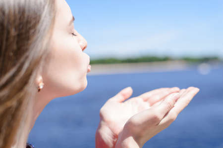 Lifestyle enjoying weather good sunny day sunbathing concept. Cropped close up side half turned view photo portrait of pretty cute sweet beautiful lady sending air kiss to the ocean landscape