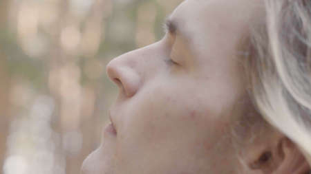 Head shot portrait of young peaceful woman breathing fresh air, enjoying deep meditation with closed eyes