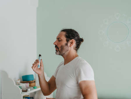 Bad breath. The concept of halitosis. A young man checks his breath with his hand