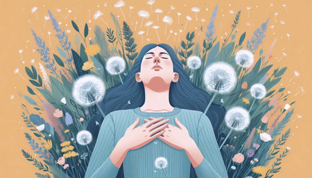 Young woman using inhaler to treat asthma allergic at flowers meadow