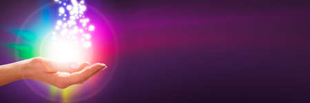 Faith Healer sending energy distant healing - female cupped hands reaching up to a white light energy orb against a lilac and pink symmetrical ethereal pattern background