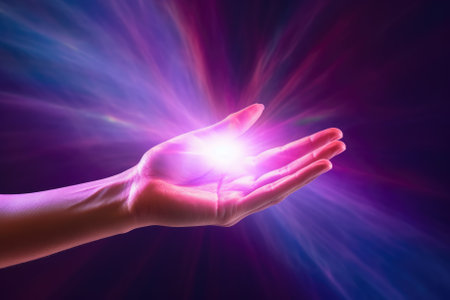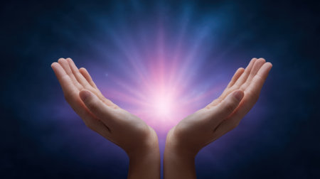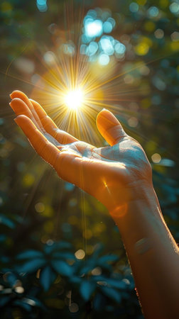 An open hand reaches out, with radiant light flowing from the fingertips, evoking feelings of hope and connection in a calm setting