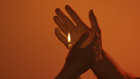 Female Hands, Fingers Splayed Out, Around Burning Candle at Night.