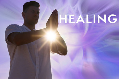 Man meditating on color background. Healing concept