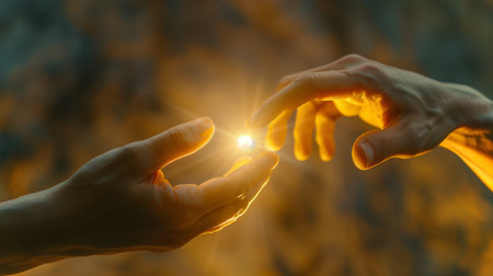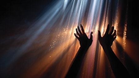 Artistic close-up of hands reaching through a curtain of light, symbolic of hope and faith