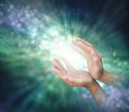 Channelling healing energy to where it is needed - male cupped hands with light between and a stream of outward spiralling green energy against a bokeh background and copy space