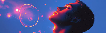 A captivating man's profile filled with radiant planetary rings and luminous celestial patterns, creating an atmosphere of infinite mystery and beauty, evoking a sense of wonder.