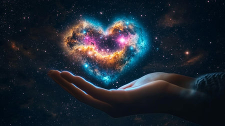 Silhouetted Hands Reaching for the Cosmic Heart Nebula in a Dreamy Starry Sky at Dusk