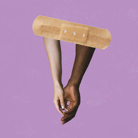 Contemporary art collage. Two hands supporting each other after vaccination. Concept oh healthy lifestyle, safety, treatment, medicine, post-pandemic life