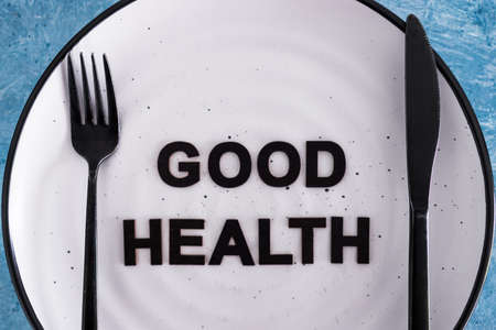 good health text on dining plate with fork and knife, concept of dieting vs healthy nutrition and intuitive eating