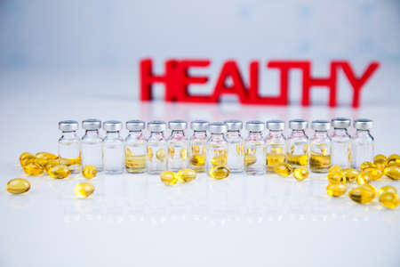 inscription HEALTH PROMOTION in wooden cubes on a white background of different pills