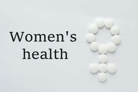 Words Women's Health and female symbol made of pills on white background, flat lay