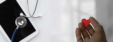 woman hand with red heart computer tablet with stethoscope for doctor health diagnosis tele medicine business on white background
