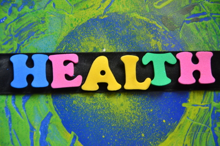 Word health is laid out from white pills on background of multicolored capsules closeup background