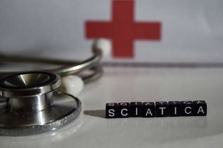 Sciatica message written on wooden blocks. Stethoscope, health care concept. Cross processed image with selective focus