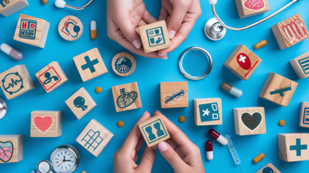 Hand-arranging wood block with healthcare medical icons. Health insurance