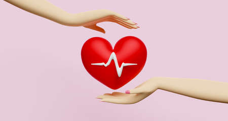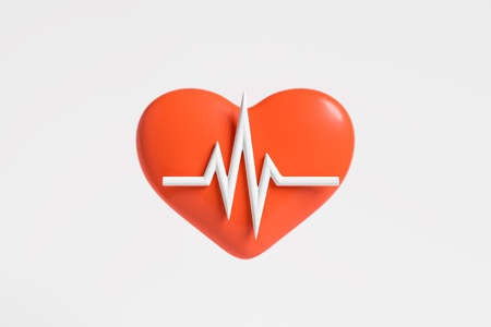 Big red heart and heartbeat line on light gray background. Cardiac assistance and pulse beat measure. Concept of medicine and health. 3D rendering