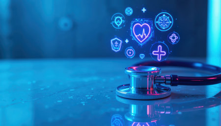 A stethoscope rests on a table while health symbols appear in blue light nearby. This scene captures a medical theme.