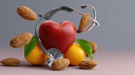 This captivating image features a red heart shape entwined with a stethoscope, surrounded by fresh almonds and vibrant citrus fruits, symbolizing health and wellness.