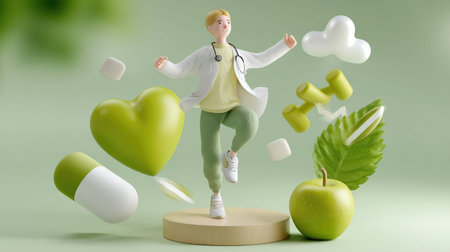 A vibrant pink arrangement showcases elements of a healthy lifestyle, including fruits, weights, and a heart icon, symbolizing fitness and wellness.