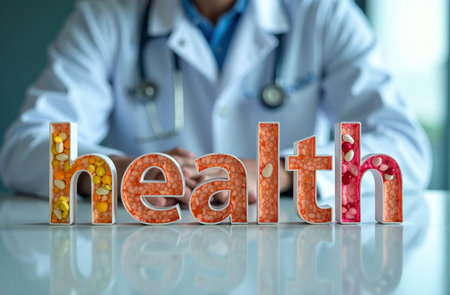 Pills in capsules in the form of the text Health on a table. Multicolored pharmaceutical pill, medical tablets for maintaining and improving health. Concept of healthcare and medicine