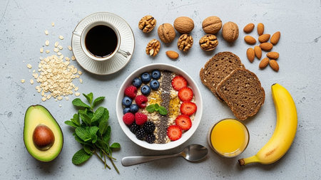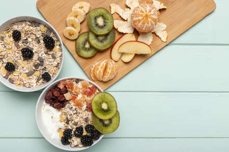 Healthy breakfast with oatmeal, berries and fruits, top view