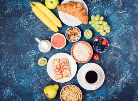Top view of healthy breakfast, pancakes with berries, cereals, oats, banana, grapes, croissant, nuts with coffee, selective focus, copy space