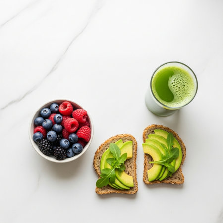 Healthy breakfast - toast with avocado, blueberries and raspberries on white marble background