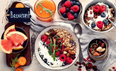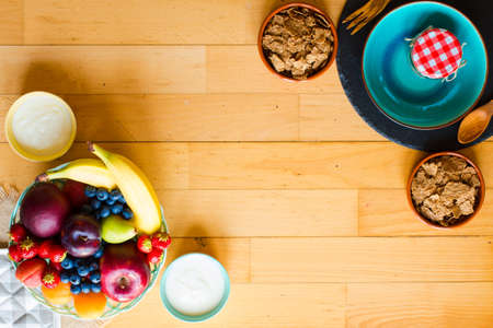 Healthy breakfast with muesli, fruits and berries on wooden table