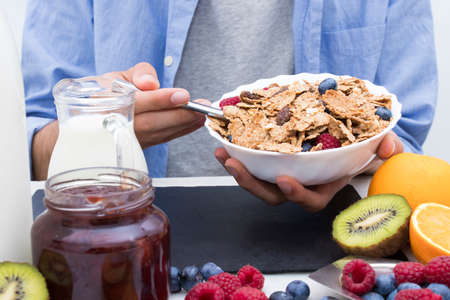 Unrecognizable man eating breakfast cereals with milk. Healthy breakfast food