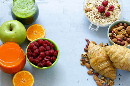 A healthy breakfast with croissants, fresh juice, nuts and raspberries