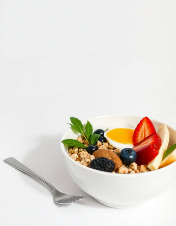 Healthy breakfast - muesli with fresh berries and egg on white background