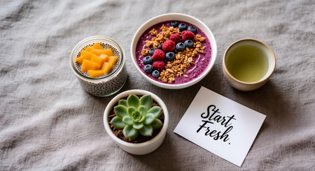 AI Generated. Healthy breakfast bowl with fruit and smoothie by window