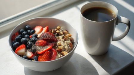 A vibrant healthy breakfast scene featuring a bowl of granola topped with fresh strawberries, blueberries, and chia seeds alongside a cup of coffee.