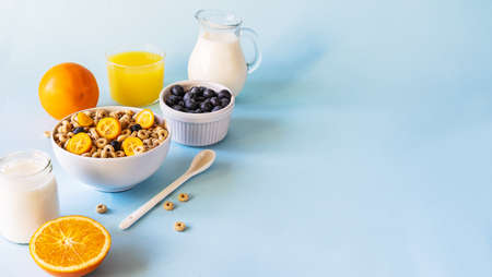 Healthy breakfast concept with wholegrain hoops, milk, orange juice, yogurt and blueberries