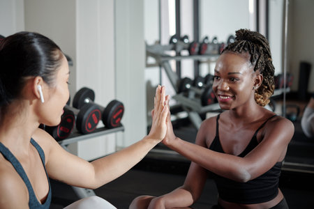 Happy pretty young woman giving high five to her fitness trainer after finishing training in gym