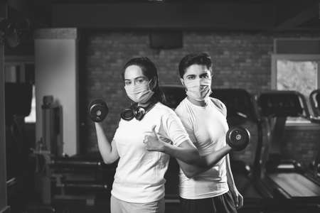 gym after corona - Indian young couple working out in gym post corona outbreak, wears protective face mask