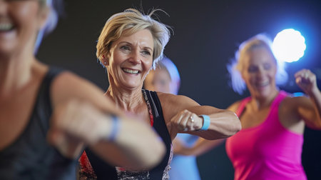 a dynamic group of fat women energetically engaged in a dance fitness class, their movements full of vitality and joy, reflecting the liberating power of dance and the celebration of diverse body types.