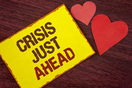 Conceptual hand writing showing Crisis Just Ahead. Business photo text Foresee failure take right action before it is late written Yellow Sticky note paper wooden background Hearts.