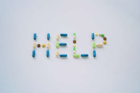 The word HELP is laid out from medical tablets and capsules.