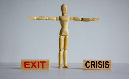 COVID-19 Pandemic Coronavirus concept. Wooden blocks with words 'exit crisis'. Wooden model of human.