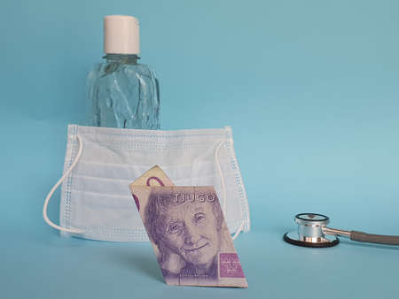swedish banknote of twenty kronor, mask, bottle with gel alcohol and stethoscope on blue background