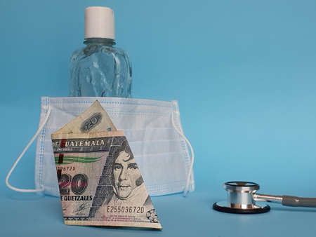 guatemalan banknote of twenty quetzales, mask, bottle with gel alcohol and stethoscope on blue background
