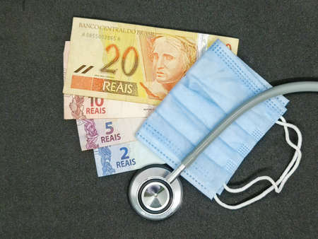Brazilian banknotes, disposable face mask and stethoscope on the black background