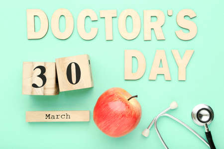 Text Doctor's Day with stethoscope, red apple and cube calendar on mint background