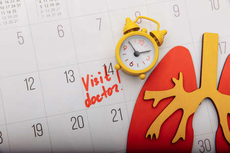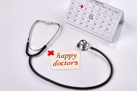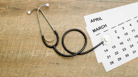 Medical and health care calendar, reminder, schedule or appointment concept, doctor's stethoscope on white clean calendar with date on solid yellow background with copy space.