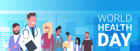 World Health Day Banner With Medical Doctor Over Group Of Patients Healthy Holiday Poster Flat Vector Illustration