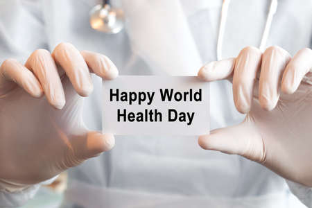 Doctor holding a card with text Happy World Health Day in both hands. Medical concept,